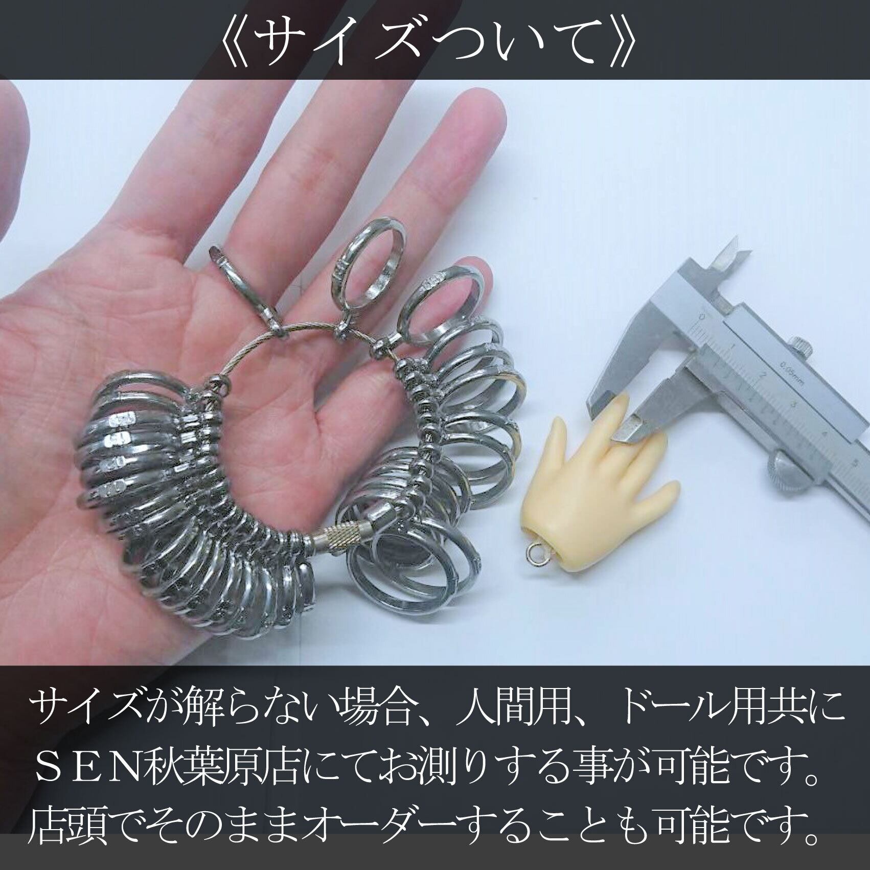 *ドール用の指輪は切れ目のない状態でお作りしております。指が深く曲がっているハンドパーツ、いろいろな指に着けたいなど、場合によっては指輪に切れ目のない状態ですと指に着けられない場合がございます。